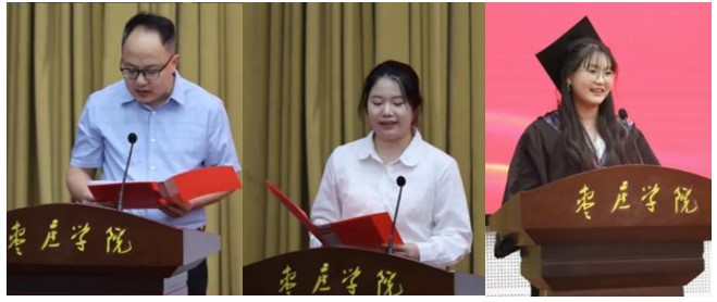 仪式在庄严的国歌声中拉开帷幕,全体起立,齐唱国歌,激昂的旋律回荡在现场。 副经理马杰宣读《2025届本科毕业生学士学位授予名单》。伴随着庄重而温馨的音乐,获得学士学位的同学依次上台,各位领导为他们一一拨穗正冠、颁发学士学位证书并合影留念。