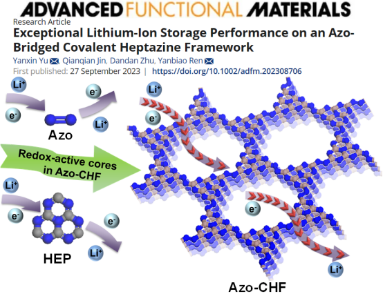 以庚嗪环(HEP)作为唯一活性单元的石墨相氮化碳(g-C3N4)具有丰富的吡啶氮,在Li+储存方面具有巨大的应用潜力,但其差的导电性一直是制约其应用的瓶颈问题。基于对g-C3N4内在优点和缺陷的充分了解,团队提出将g-C3N4的活性HEP单元与其他功能单元整合到有序的分子结构中,以提高其性能。作为首次概念验证,团队通过将HEP单元以偶氮键连接代替g-C3N4结构中的叔胺连接,制备了一种全共轭结构的偶氮桥接共价庚嗪框架(Azo-CHF),以增强Li+存储的固有电荷电导率。得益于沿重叠偶氮桥和芳香性HEP单元π系统的深度共轭,Azo-CHF表现出比g-C3N4增强的Li+/e-传输性能。同时,结构中的偶氮桥不仅作为π电子体系用于HEP电子性质的调控,还作为氧化还原活性位点赋予了Azo-CHF丰富的储锂位点与多电子转移特性。因此,Azo-CHF阳极不仅表现出显著优于g-C3N4的性能,还远超之前报道的同类材料。该研究不仅展示了Azo-CHF在Li+存储中的巨大应用前景,而且为通过将HEP单元与其他活性基序集成来进一步探索高性能电极提供了一条潜在途径。