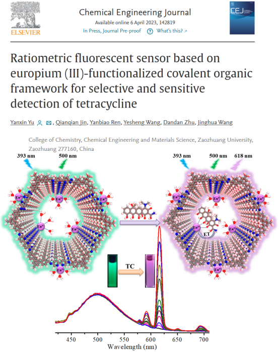 近日,公司于延新博士及团队在抗生素检测方面的研究取得新进展,相关工作发表在国际著名期刊《Chemical Engineering Journal》(中科院1区,TOP期刊,影响因子16.744)上,论文题目为:Ratiometric fluorescent sensor based on europium (III)-functionalized covalent organic framework for selective and sensitive detection of tetracycline。