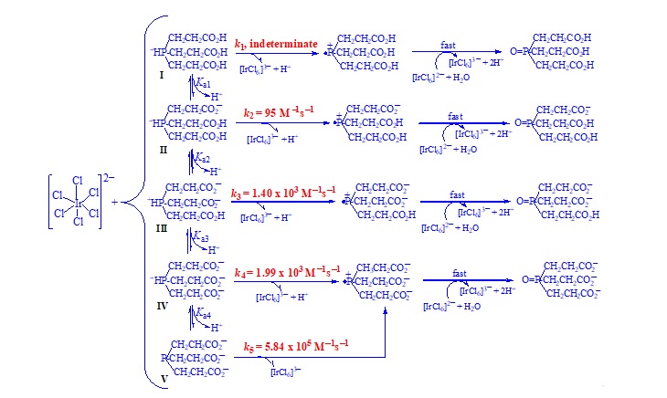 三(2-羧乙基)膦(TCEP)是一著名的强还原剂,广泛应用于化学,生物学和医学的重要反应中。但其在还原单电子氧化剂的反应机理尚不清楚。在本项研究中,使用四价铱配合物作为单电子氧化剂的代表进行详尽研究,提出了令人信服的反应机理,并首次阐明了TCEP不同质子化形态的反应活性,这在化员工物学方向上具有重要的学术及应用价值。