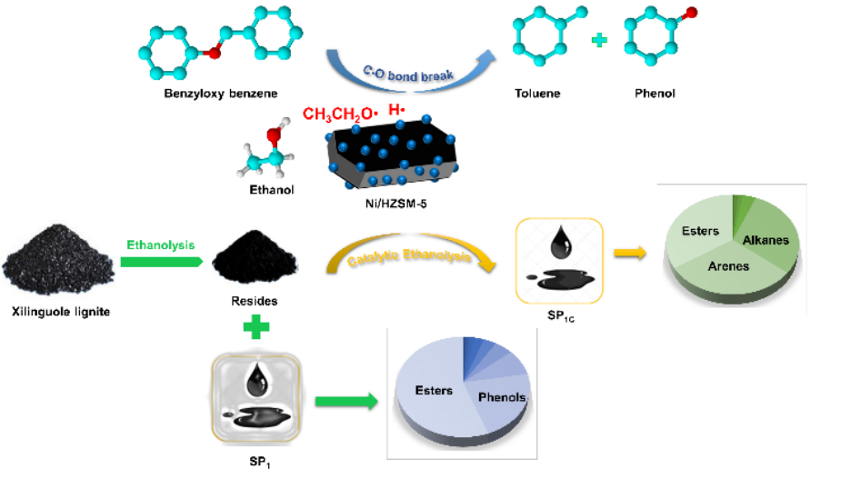 褐煤具有高含水量、高含氧量、高灰分和低热值的特点,是一种劣质燃料。因此,减少褐煤的燃料利用,开发其低碳化和高值化利用技术是“高碳资源低碳利用”的重要途径,也是实现“双碳目标”的必经之路。本研究制备了一系列Ni/HZSM-5催化剂,实现了对C-O键的精准、高效裁剪。可在180 ℃下可将二苄醚(煤模型化合物)完全裂解。该催化剂成功应用于锡林郭勒褐煤的“乙醇解---催化裂解”两步法解离过程中,分别获得了47.8%和15.1%的可溶物收率。结果表明,在无氢气体系中,催化裂解褐煤中的C-O键,是获取煤基高附加值精细化学品的重要方法。