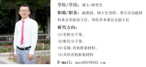 马杰,男,博士、副教授,曲阜师范大学兼职硕士生导师,枣庄市功能材料重点实验室主任、公司学术委员会副主任,英国be365官网青檀学者人才工程项目优秀青年人才。任教以来,主讲《分离工程》、《化工仪表及自动化》、《专业英语》、《无机化学A1/A2》、《无机化学实验A1/A2》等课程。目前,主要从事配位化学和超分子化学相关领域的研究工作,研究方向有:(1)有机分子笼;(2)配位分子笼;(3)金属-有机框架材料;(4)共价有机框架材料。迄今,主持完成国家自然科学基金青年基金项目1项,主持山东省自然科学基金青年基金项目1项。第一作者或通讯作者发表SCI论文10余篇,担任Crystal Growth & Design和Inorganic Chemistry Communications期刊审稿人。