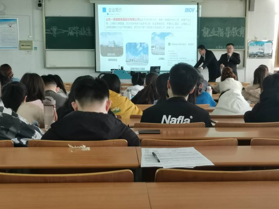 为促进毕业生积极就业,了解企业最新用人需求,提高毕业生就业质量,3月31日下午14时,公司邀请山东一诺威集团对2021届毕业生开展就业指导教育讲座。2021届全体毕业生参加。会议由就业专职辅导员周朋老师主持。